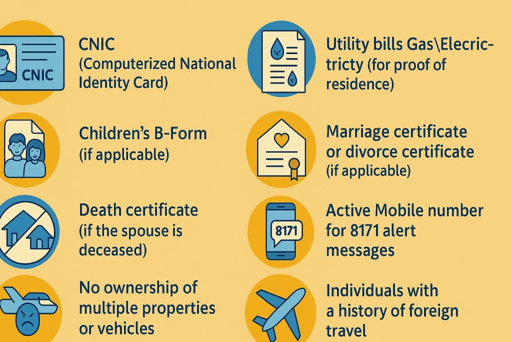 Carry your original CNIC, children’s B-Forms, recent utility bills, and a working mobile number.
