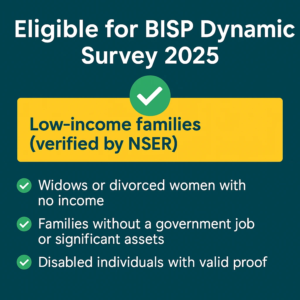Unlike the older NSER survey from 2011 (which was a one-time process), the Dynamic Survey is ongoing. It helps ensure that BISP benefits are given to families who currently qualify, based on updated data like income, family size, marital status, or address.