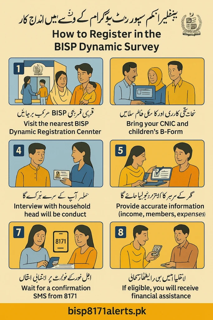 BISP 8171 registration can be completed in two ways: by visiting a Dynamic Registration Center (DRC) or through a Mobile Registration Van (MRV) that reaches remote areas. Both methods are official and aim to make the process easy for eligible families.